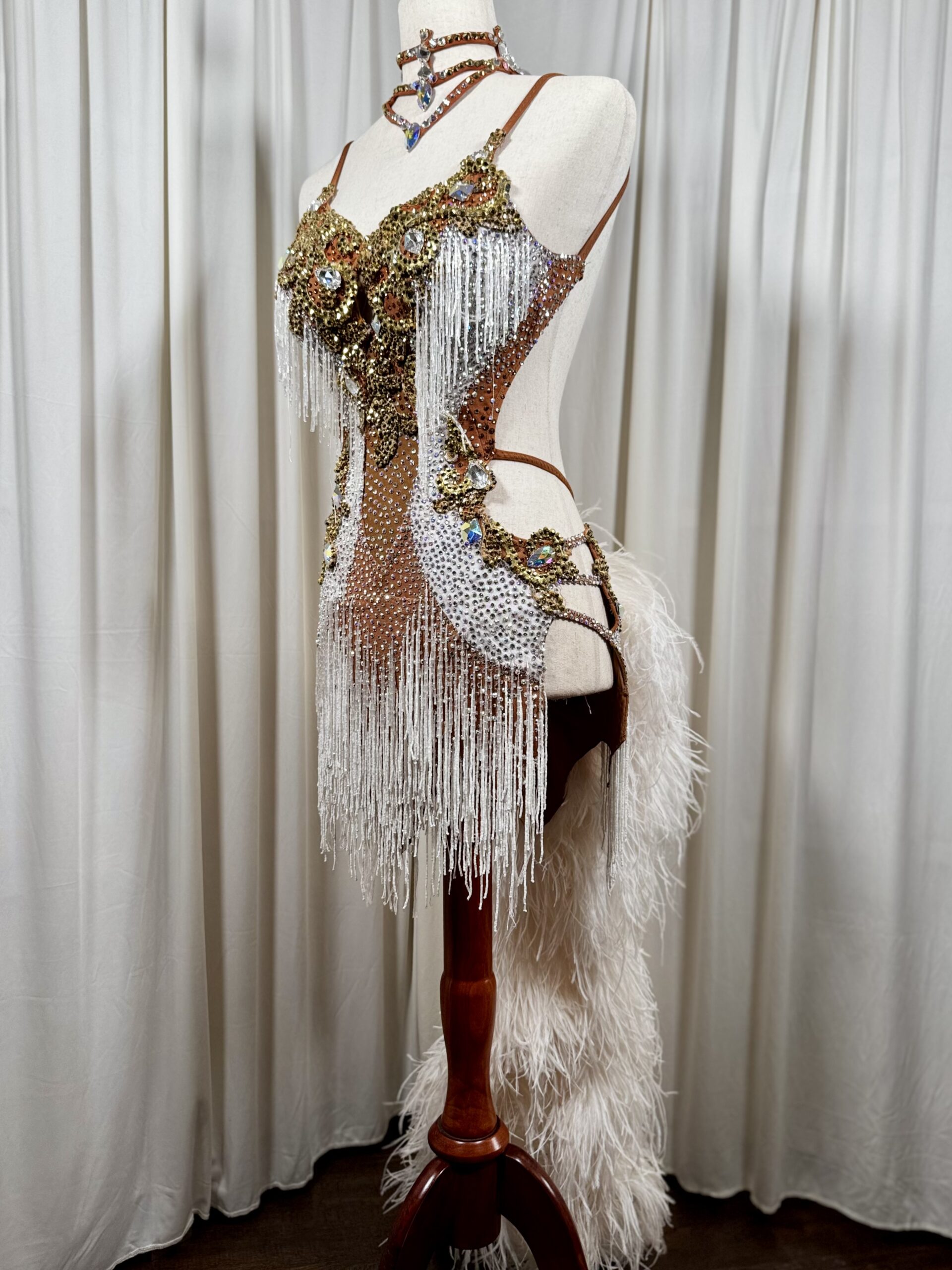 Stunning, sexy latin ballroom dress by @designsbykalina, with sparkling stoning and long feather tail. Size XS-Small. Height 5’1” to 5’7′ (152 cm- 167 cm)