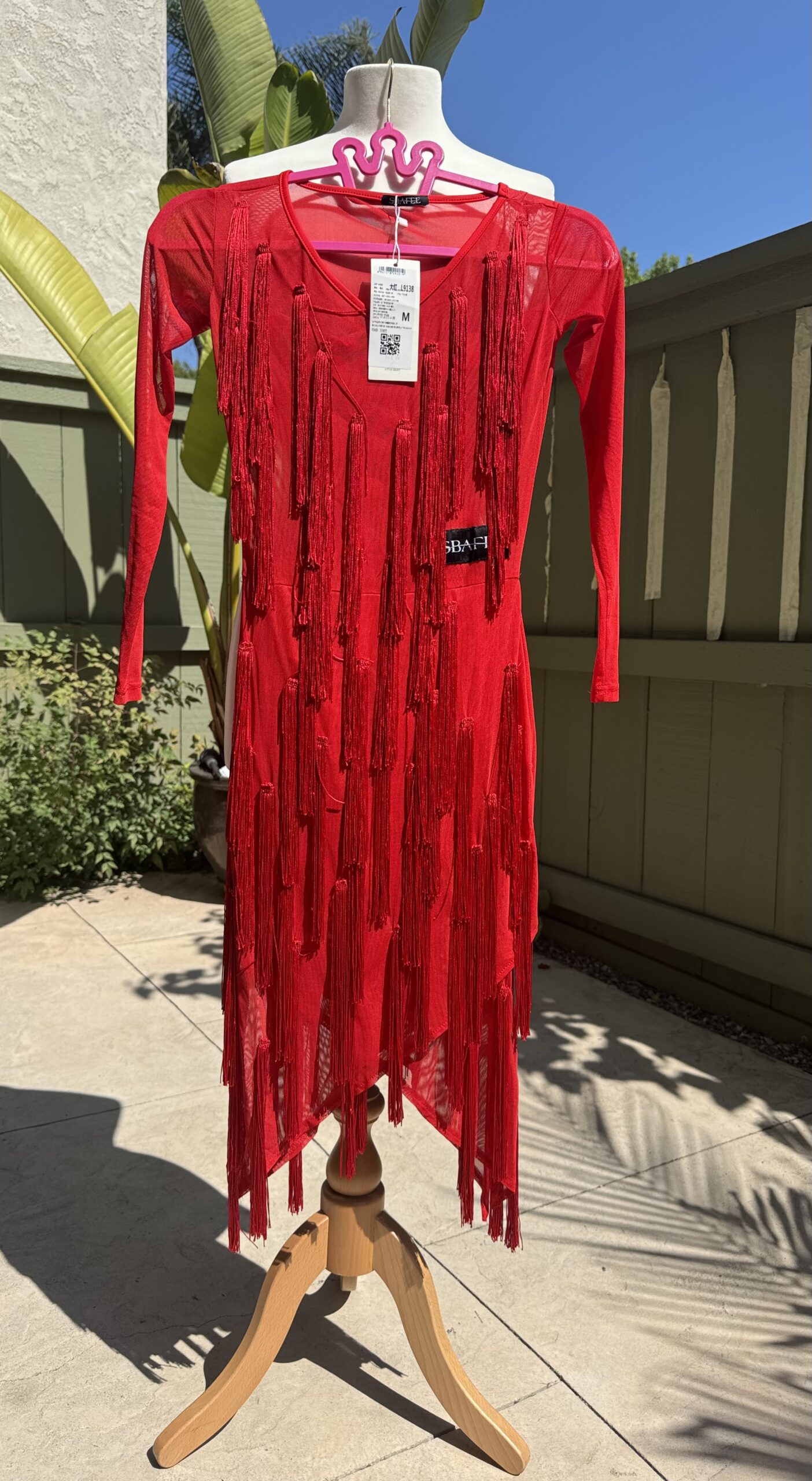 Brand new Latin dress for sale with tassels, mesh and build in body suit. Red vibrant color. Size Small, 0-4